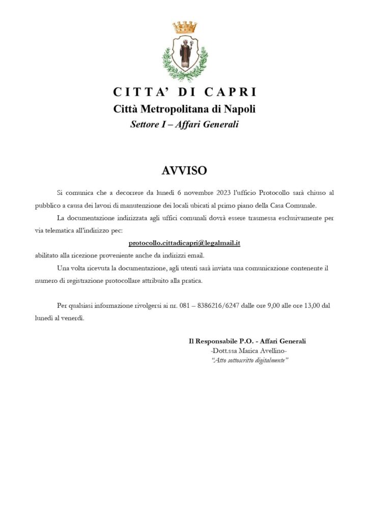 Chiude ufficio Protocollo per lavori Notizie in tempo reale Novembre 5, 2023Novembre 5, 2023RedazioneCommenta Chiude ufficio Protocollo per lavori Condividi su