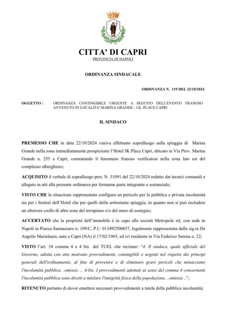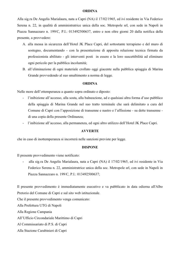 Chiusa la spiaggia di Marina Grande ed inagibile hotel 5 stelle Jk Place Capri. Firmata ordinanza urgente e contenibile. Il Giornale Notizie in tempo reale Ottobre 23, 2024Redazione Condividi su