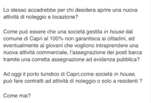In una mattinata di agosto, si è svolto un consiglio comunale nel caldo della piazzetta, dove all’ordine del giorno vi era la costituzione della nuova società “Capri Isola Azzurra”, che dovrebbe gestire unitamente al Comune di Anacapri il ciclo della nettezza urbana dell’intera isola. Un argomento all’ordine del giorno del consiglio comunale di Capri che è stato rinviato dalla maggioranza. Inoltre, si è registrato un diverbio tra la minoranza e la maggioranza riguardo al deposito del question time, che viene disciplinato dal regolamento del consiglio comunale della città di Capri all’articolo 40 bis. Nel prossimo consiglio comunale ci saranno ulteriori ordini del giorno, tra cui la stessa costituzione della società “Capri Isola Azzurra” e i vari question time presentati, ovviamente, dall’opposizione. L’avvocato Gaetano Simeoli, proprio in merito alla costituzione della nuova società “Capri Isola Azzurra”, ha depositato nei termini previsti dall’avviso pubblico delle osservazioni che alleghiamo oggi per i nostri lettori.