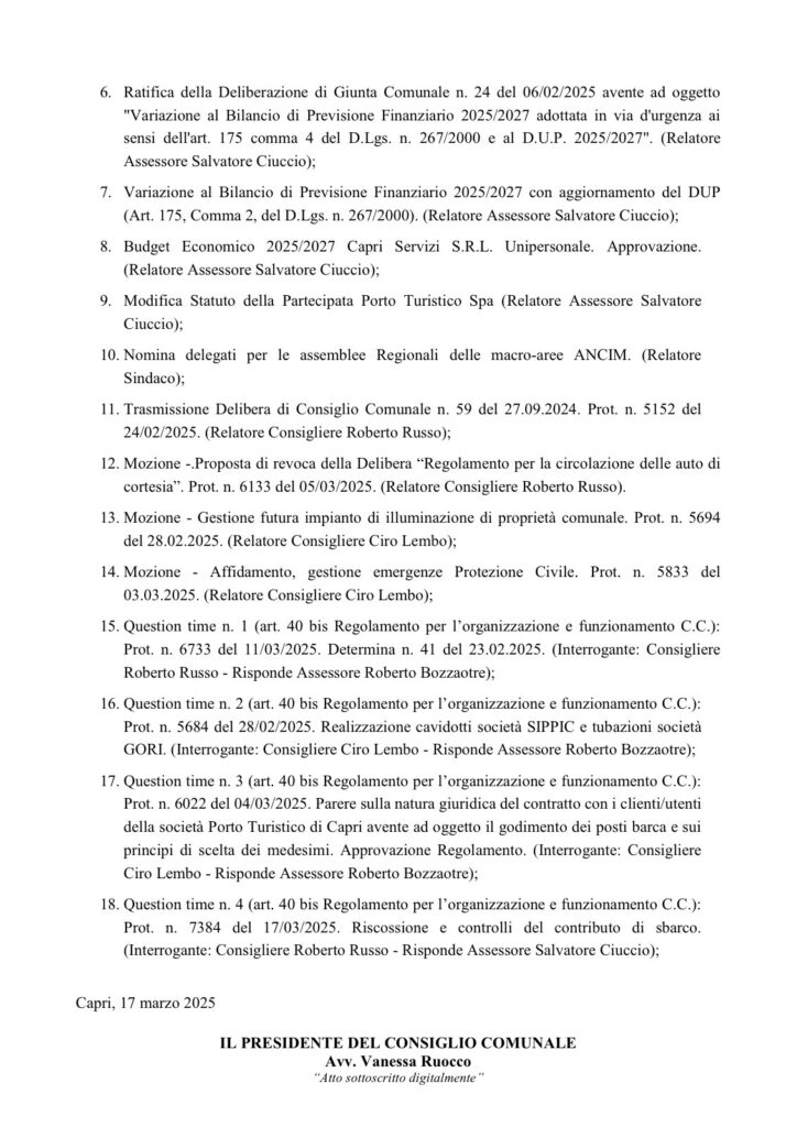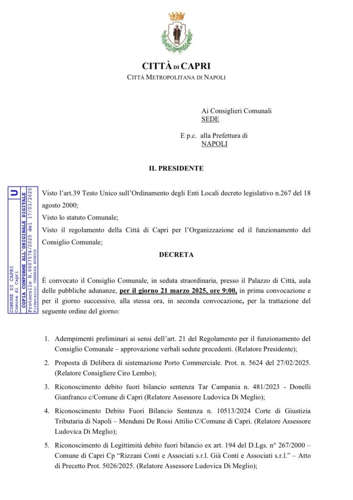 Convocato il Consiglio Comunale di Capri, al momento ci sono 18 punti all’ordine del giorno. Il Giornale Notizie in tempo reale Marzo 18, 2025Redazione Condividi su
