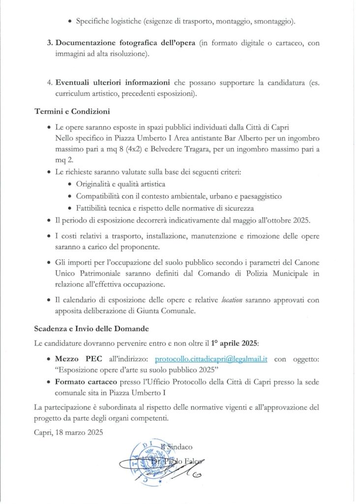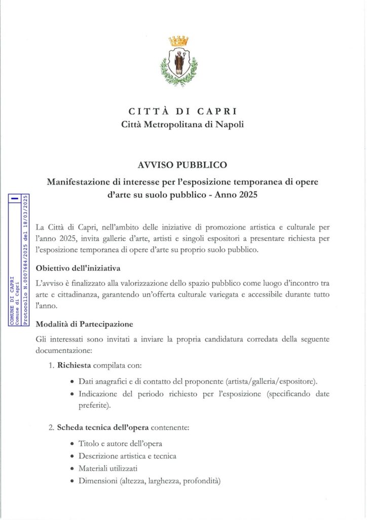 Esposizione opere su suolo pubblico. Ecco l’avviso domande entro il 1 aprile 2025 Il Giornale La Piazzetta Notizie in tempo reale Marzo 18, 2025Redazione Condividi su