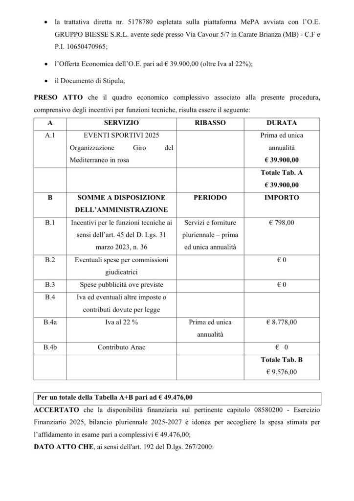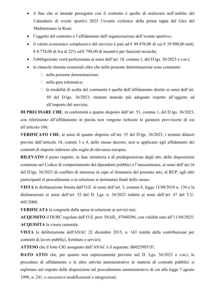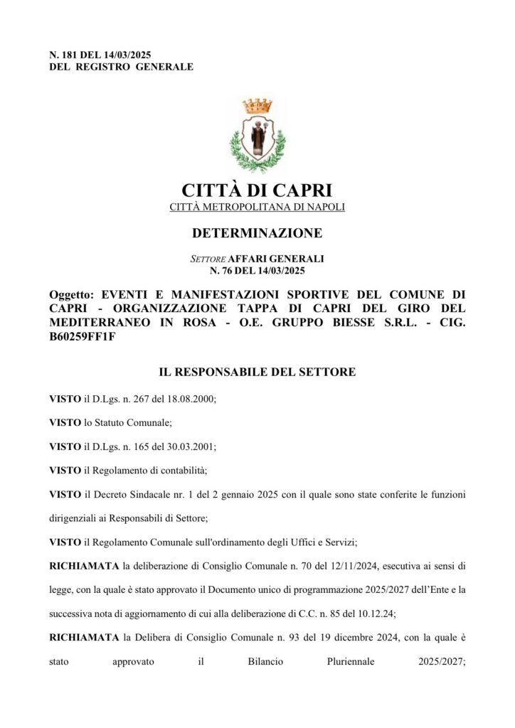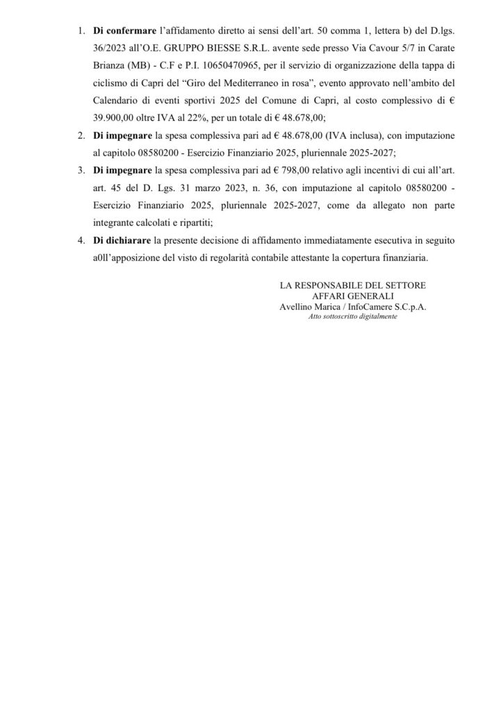 Giro in Rosa in bici, investiti circa 50 mila euro per l’organizzazione. EVENTI E MANIFESTAZIONI SPORTIVE DEL COMUNE DI CAPRI – ORGANIZZAZIONE TAPPA DI CAPRI DEL GIRO DEL MEDITERRANEO IN ROSA – O.E. GRUPPO BIESSE S.R.L.S. Il Giornale La Piazzetta Notizie in tempo reale Marzo 18, 2025Marzo 18, 2025Redazione EVENTI E MANIFESTAZIONI SPORTIVE DEL COMUNE DI CAPRI – ORGANIZZAZIONE TAPPA DI CAPRI DEL GIRO DEL MEDITERRANEO IN ROSA – O.E. GRUPPO BIESSE S.R.L. Condividi su