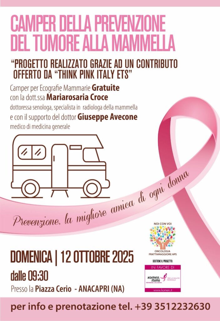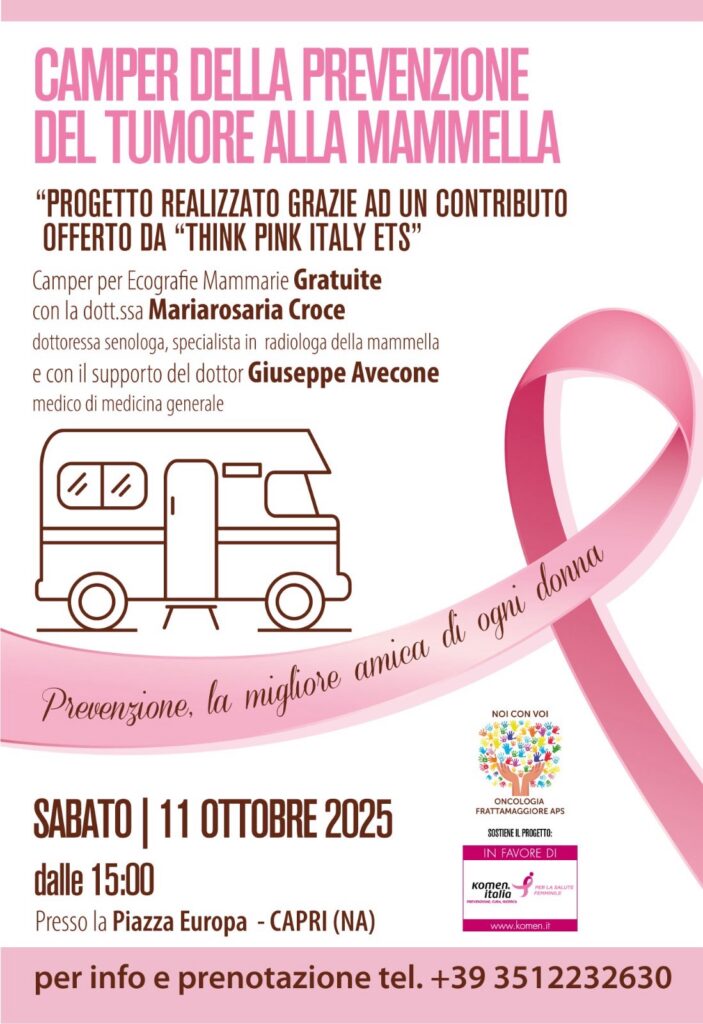L’iniziativa, intitolata “Tour in strada facendo – Camper della prevenzione”, sarà presente sabato 11 ottobre dalle ore 15 in Piazza Europa a Capri e domenica 12 ottobre dalle ore 9.30 in Piazza Cerio ad Anacapri, offrendo ecografie mammarie gratuite a cura della dott.ssa Mariarosaria Croce, senologa specialista in radiologia della mammella, con il supporto del dott. Giuseppe Avecone, medico di medicina generale. Il progetto nasce con l’obiettivo di ricordare alle donne l’importanza della prevenzione e dei controlli periodici, ma anche di avvicinare la salute ai territori, grazie a un tour itinerante che attraversa le province di Napoli e Salerno.