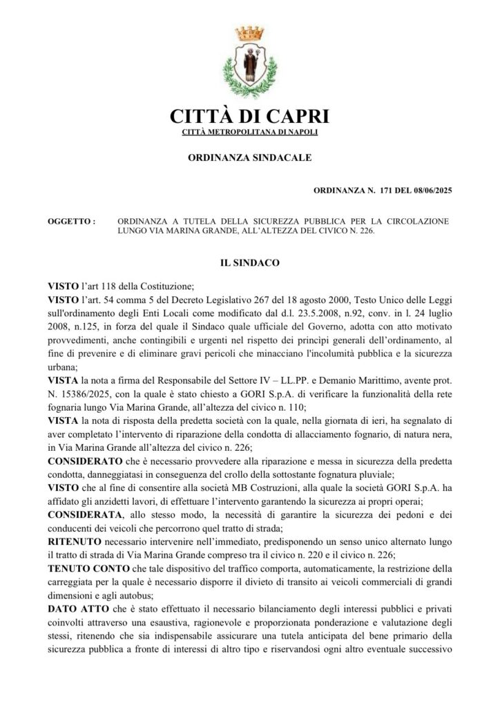 Limitazione della circolazione sulla provinciale Marina Grande? Il Giornale Notizie in tempo reale Giugno 8, 2025Giugno 8, 2025Redazione A breve dovrebbe essere pubblicata un’ordinanza di limitazione della circolazione lungo la strada provinciale Marina Grande; il provvedimento è necessario a causa di lavori urgenti sulla stessa strada. Aggiornamento ecco l’ordinanza del Sindaco. Condividi su