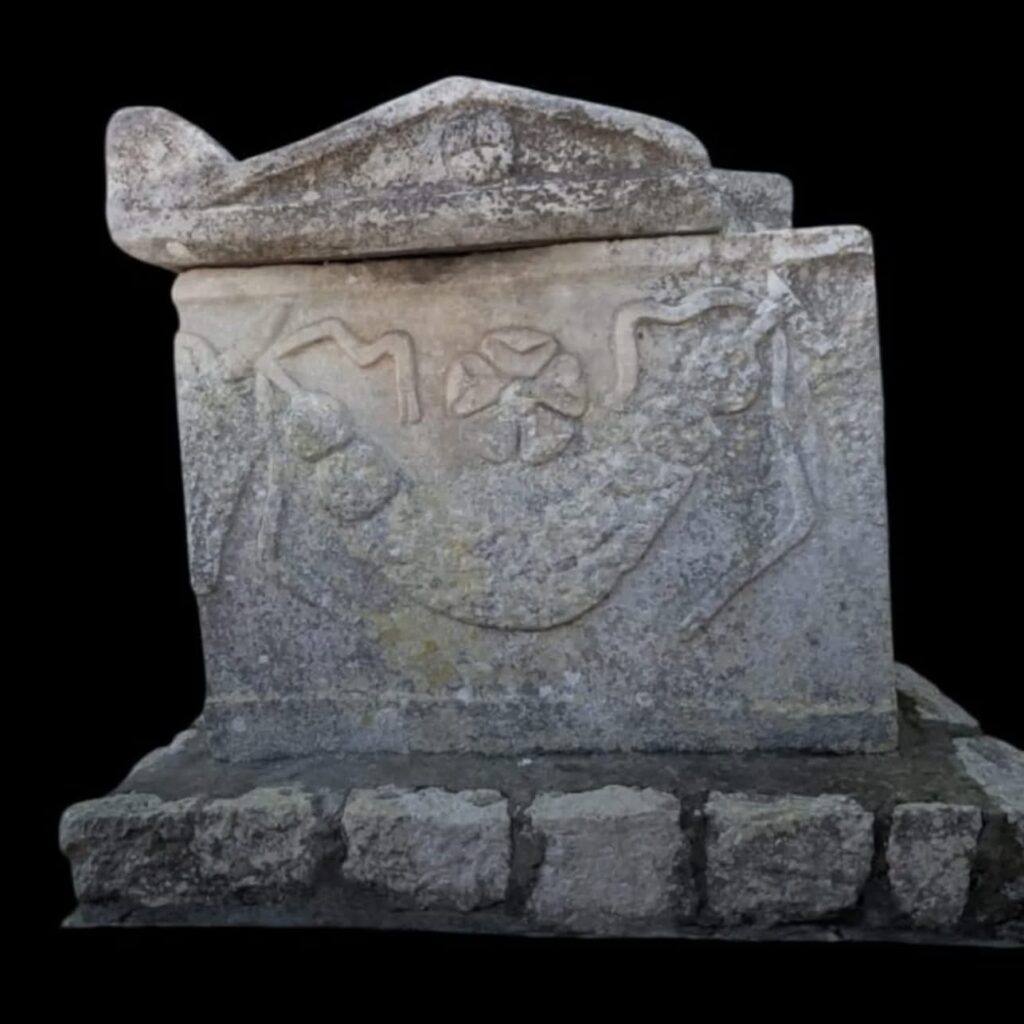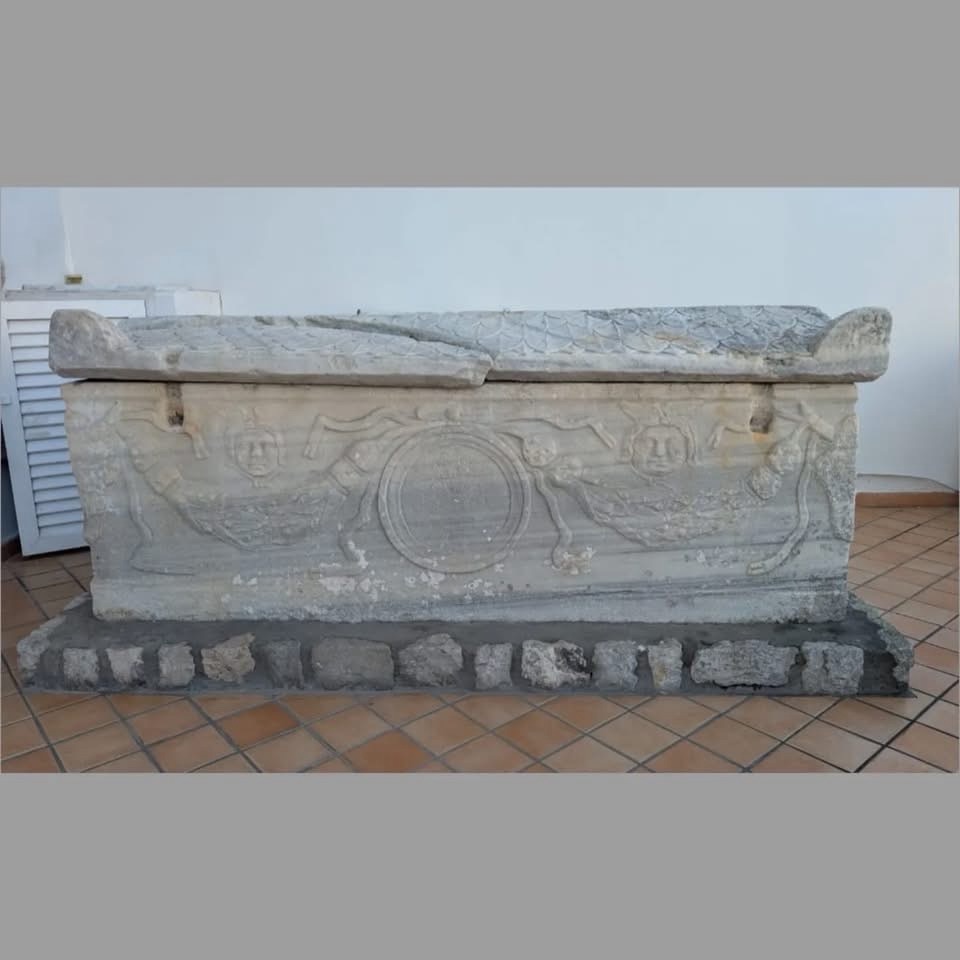 Il sarcofago, databile al II sec. d.C. fu trovato nella chiesa di San Costanzo nel 1810 e fu subito attribuito all’imperatrice poiché all’interno fu trovata deposta una donna con pregiatissimi abiti. Fu conservato fin dalla fine dell’Ottocento presso l’Hotel Grotte Bleue, oggi non più esistente. 🔎