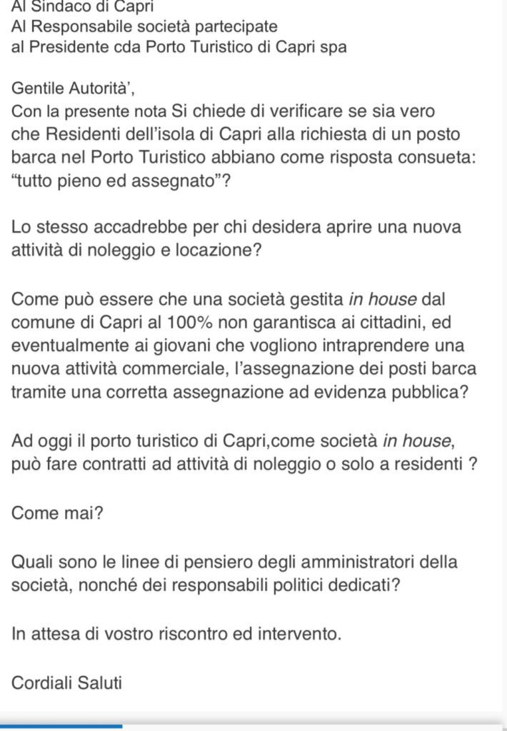 Porto Turistico di Capri: contratti di ormeggio Bando pubblico? Notizie in tempo reale Gennaio 15, 2024Gennaio 15, 2024RedazioneCommenta Porto Turistico di Capri: contratti di ormeggio Bando pubblico? Assegnazioni posto barca porto turistico di Capri: ecco la lettera inviata al Sindaco di Capri e al Presidente del consiglio di amministrazione PTC. Condividi su