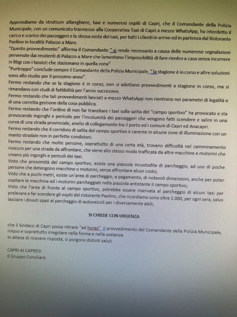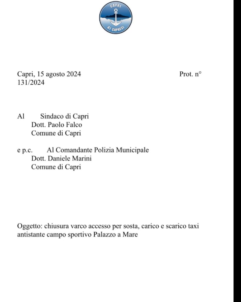 Taxi a Palazzo a Mare opposizione in Consiglio scrive al Sindaco Paolo Falco ed al Comandante Daniele De Marini Il Giornale Notizie in tempo reale Agosto 20, 2024Redazione Condividi su